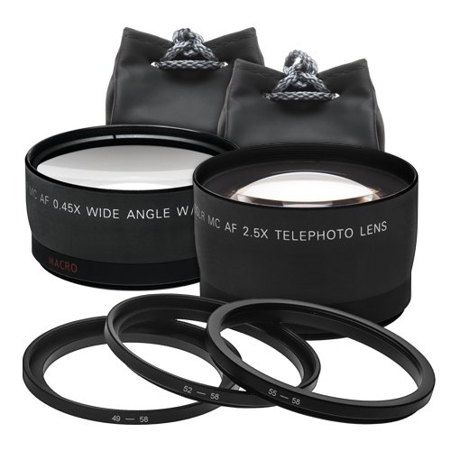 - .45x Wide Angle Lens (58mm) + <5> 2x Telephoto Lens (58mm) + Spare LP-E10 Battery for Canon +