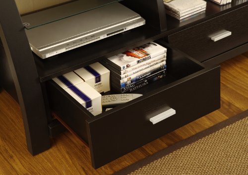 - Six divided compartments; glass and wooden shelves; three spacious drawers; accommodates most flat-screen TVs up to 60-inch