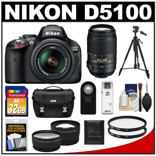 Nikon D5100 Digital SLR Camera & 18-55mm G VR DX AF-S Zoom Lens with 55-300mm VR Lens + 32GB Card + .45x Wide Angle & 2x Telephoto Lenses + Remote + (2) Filters + Tripod + Accessory Kit at a price that offers in USA.